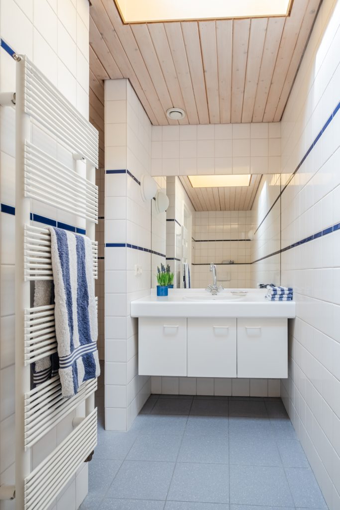 Bathroom, fully tiled and equipped with a vanity sink, a walk-in shower with a thermostatic faucet, a wall-mounted toilet and a designer radiator.