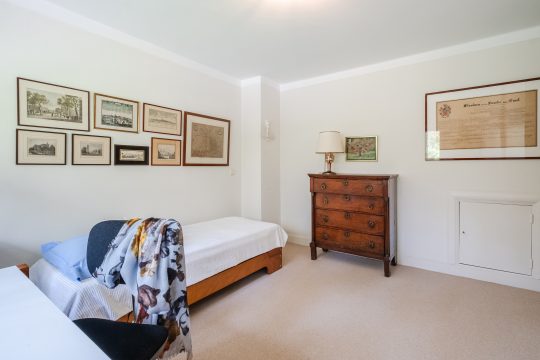 Bedroom 3, with carpeted floors, wallpapered walls and a sanded ceiling.