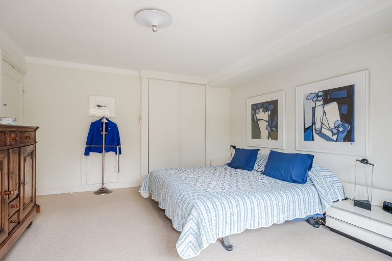 Slaapkamer 1, de Master Bedroom, met vloerbedekking, behangen wanden en schuurwerk plafond. Deze slaapkamer is voorzien van inbouwkasten met twee schuifdeuren, schuifpui naar het balkon en een deur die toegang biedt tot de badkamer.