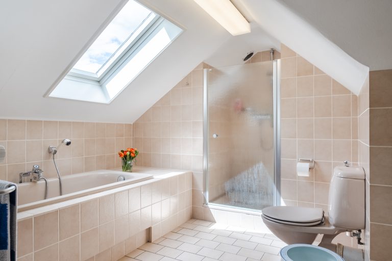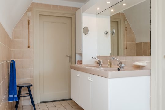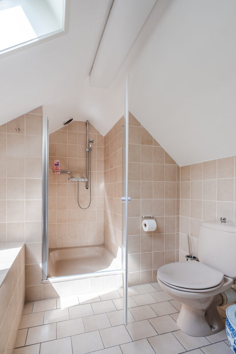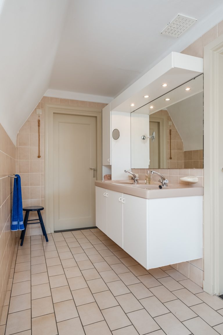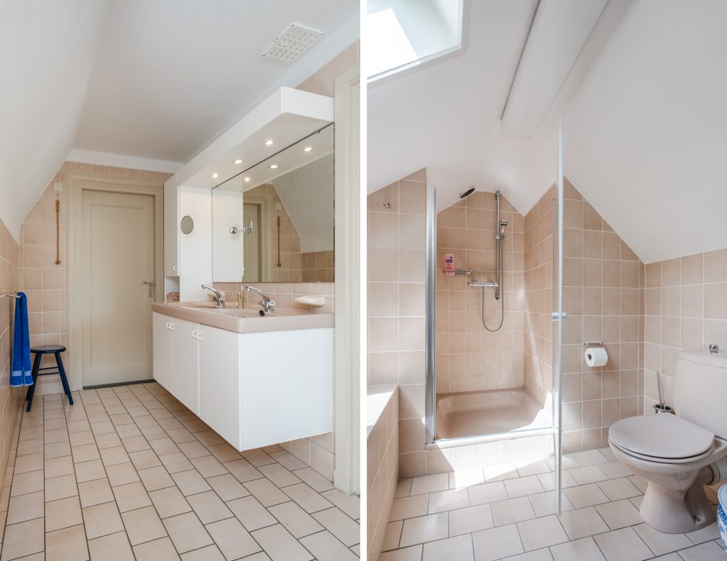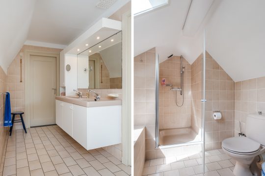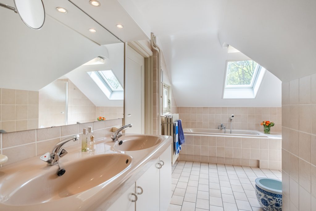Badkamer, geheel betegeld en voorzien van een dubbele wastafel in meubel, douchehoek met thermostaatkraan, ligbad met ééngreeps mengkraan, een duobloc closet en een dakraam.