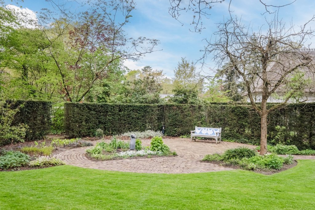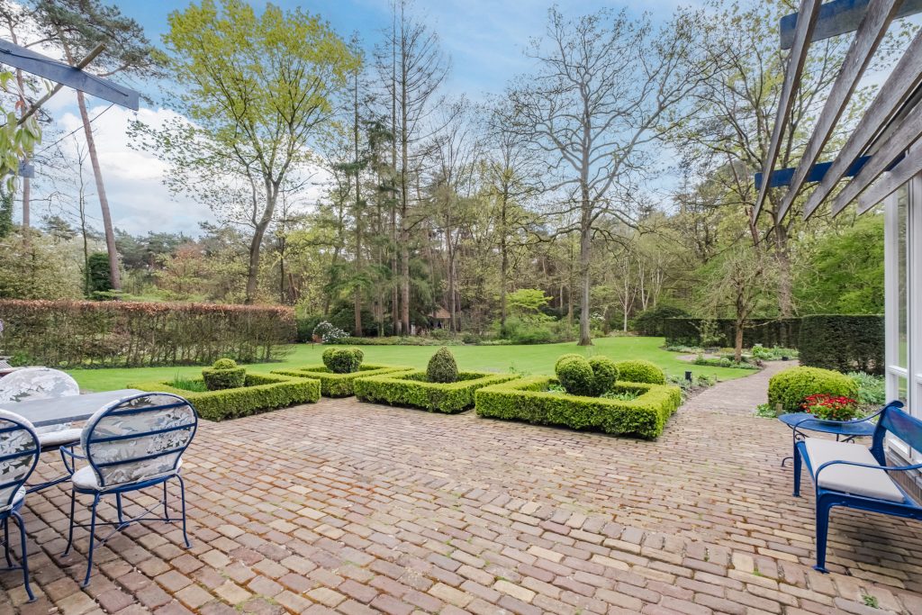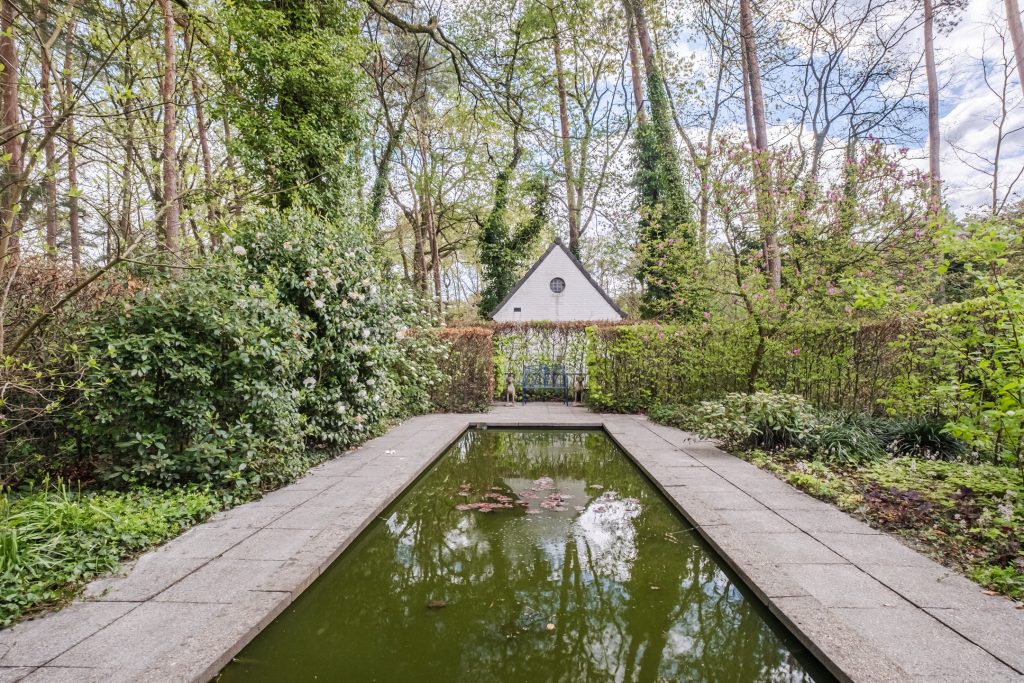 Landscaped backyard, this architecturally designed garden borders the Gemeentebossen van Waalre and features various terraces, a pond, an outdoor faucet, electrical outlets, garden lighting and a sprinkler system.