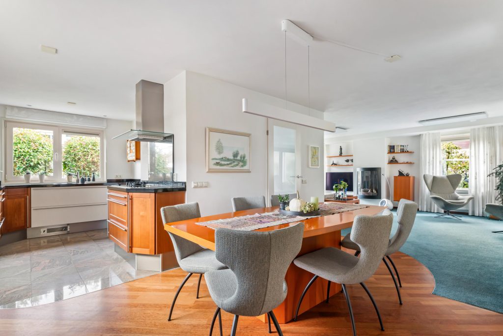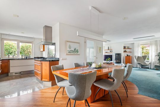 Open kitchen, with tiled floor, the kitchen is equipped with luxury kitchen fittings with solid wood doors, a natural stone countertop with bevelled edge and a stainless steel sink. The kitchen is located in a corner and has an additional kitchen unit. The kitchen is also equipped with a refrigerator, a 4-burner induction hob with gas wok burner, stainless steel extractor hood, a combi-oven, dishwasher at a comfortable height, apothecary cabinet and a kitchen faucet with aerator.