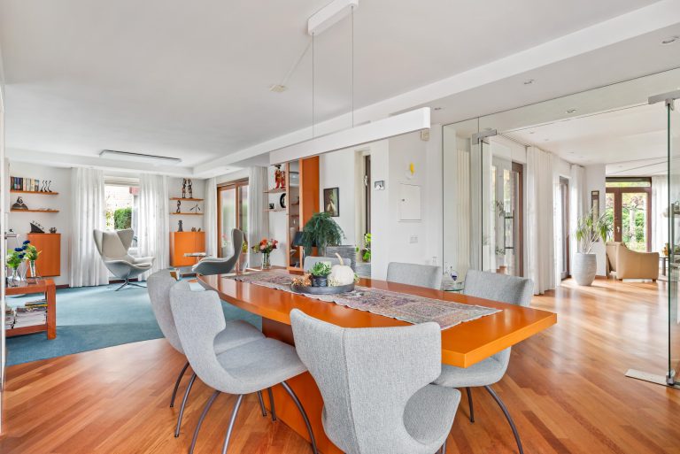 The utility room is also accessible from the dining room. Utility room with tiled floor with underfloor heating, sanded walls and ceiling. Equipped with connections for washing appliances and a sink. The indoor garage is accessible from the utility room and has carpeted floors, brick walls and a wooden ceiling. The garage has a large sliding wardrobe and the heating system.