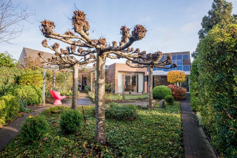 Aangelegde voortuin, met oprit voor 2 auto’s en een vrijdragende carport.