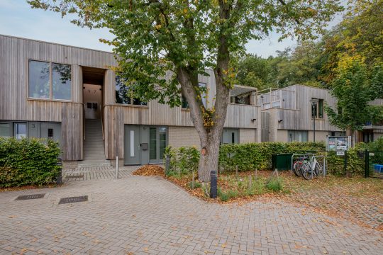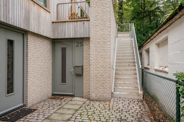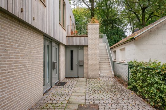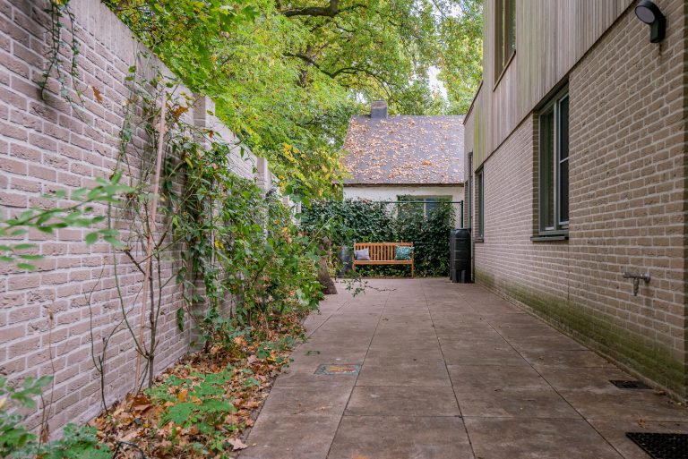 From the private parking space, it is a short walk along the cobblestone path to the entrance of the apartment. Due to the location of this corner apartment at the end of the courtyard, it is a quiet spot surrounded by greenery and there is no through traffic.