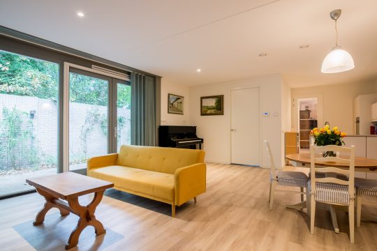 Vanuit de keuken loopt men door naar de woonkamer. De ruime woonkamer heeft eveneens een pvc vloer met vloerverwarming en – koeling, schuurwerk wanden en spuitwerk plafond. Deze is tuingericht en via openslaande tuindeuren heeft men toegang naar de tuin. Vanuit de woonkamer is er ook toegang tot een slaapkamer.