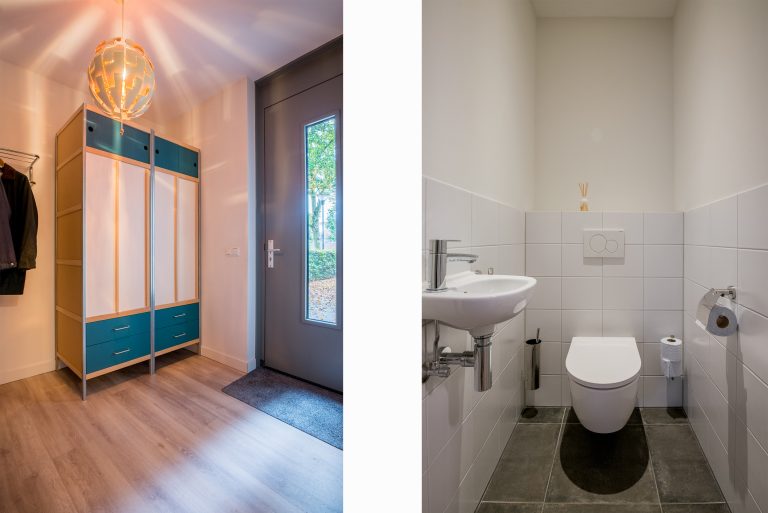 Hal, met pvc vloer met vloerverwarming en – koeling, schuurwerk wanden en spuitwerk plafond. De hal is voorzien van de meterkast met 10 lichtgroepen, 1 krachtgroep, 3 aardlekschakelaars en de PV groep.