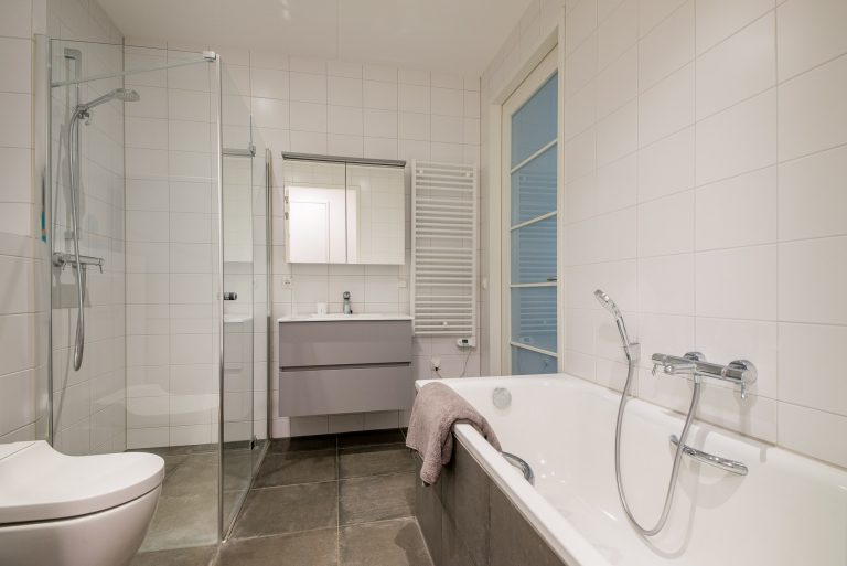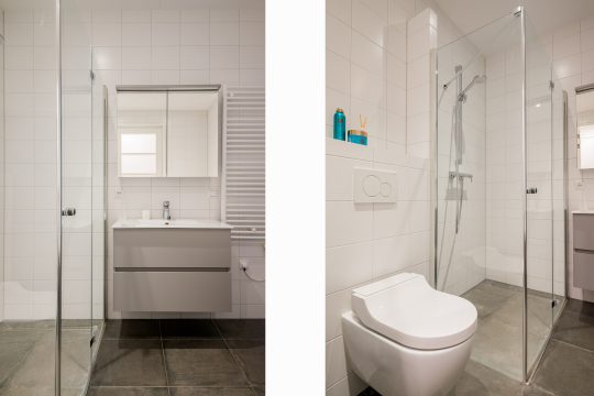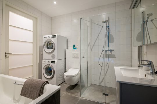 Badkamer, geheel betegeld en voorzien van een wastafelmeubel, een douchehoek met cabine en thermostaatkraan, een ligbad met thermostaatkraan, een wandcloset, een designradiator en de aansluitingen voor de wasapparatuur.