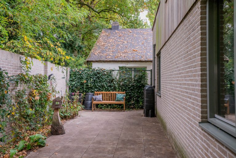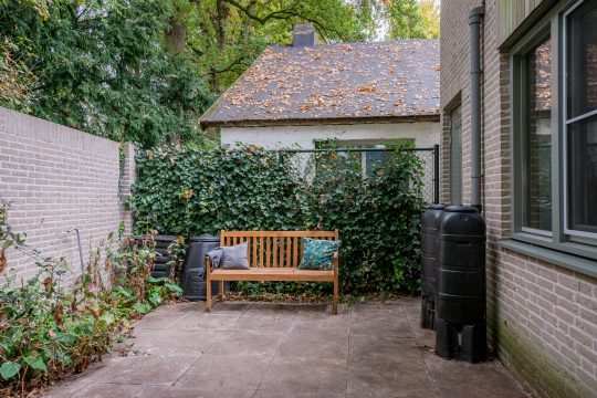 Aangelegde achtertuin, grotendeels bestraat en met groene en gemetselde omheining. Vanuit de tuin toegang tot de externe maar inpandige berging. Deze is voorzien van elektra en water en voldoet prima voor het opbergen van het tuingereedschap. Er is ook nog een extra berging bij de gezamenlijke bergingen.