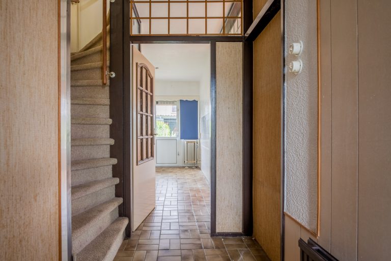 Hall, with tiled floor, sanded walls and ceiling. From the hall, access to the toilet, meter cupboard, kitchen and staircase to the first floor.