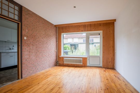 Doorzon woonkamer, met parketvloer, deels behangen en deels wanden voorzien van houten schrootjes en met schuurwerk plafond. Vanuit de woonkamer heeft men middels een deur toegang tot de achtertuin.