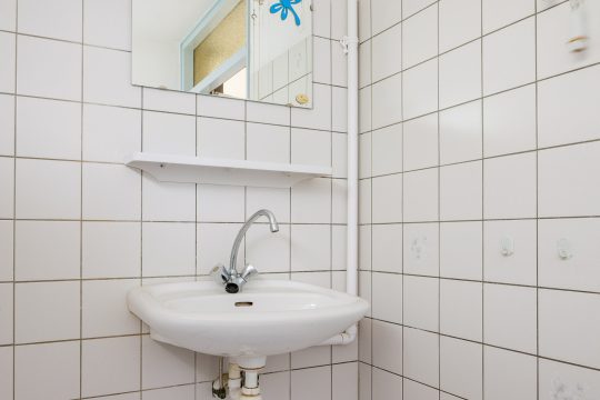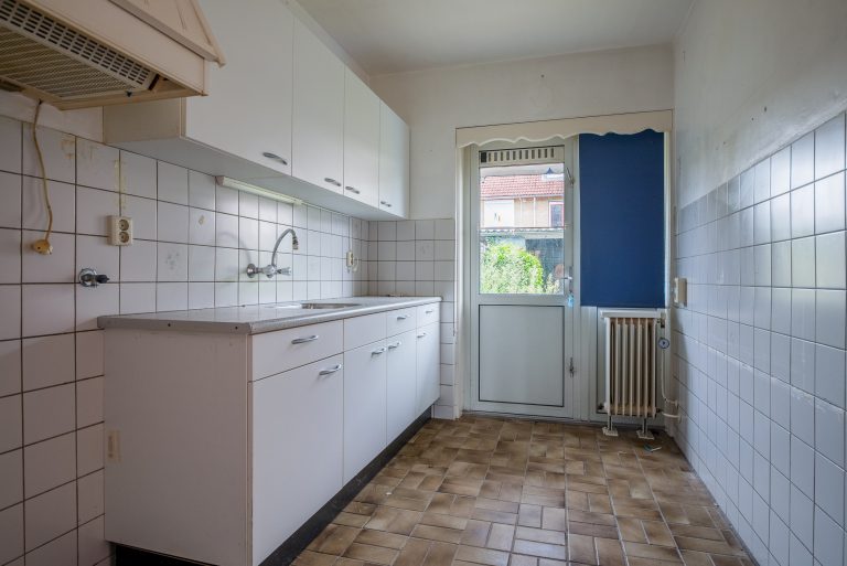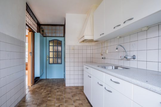 Closed kitchen, with tiled floor, partially tiled walls and sanded ceiling. The kitchen is equipped with simple white kitchen units with a plastic countertop and stainless steel sink. Under the staircase, but accessible from the kitchen, is a basement cupboard (-/- 50 cm). The backyard is also accessible from the kitchen through a door.