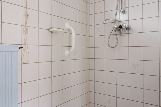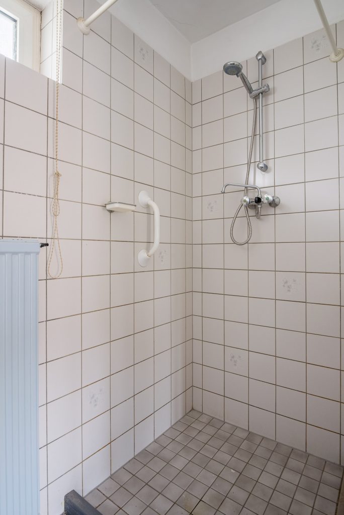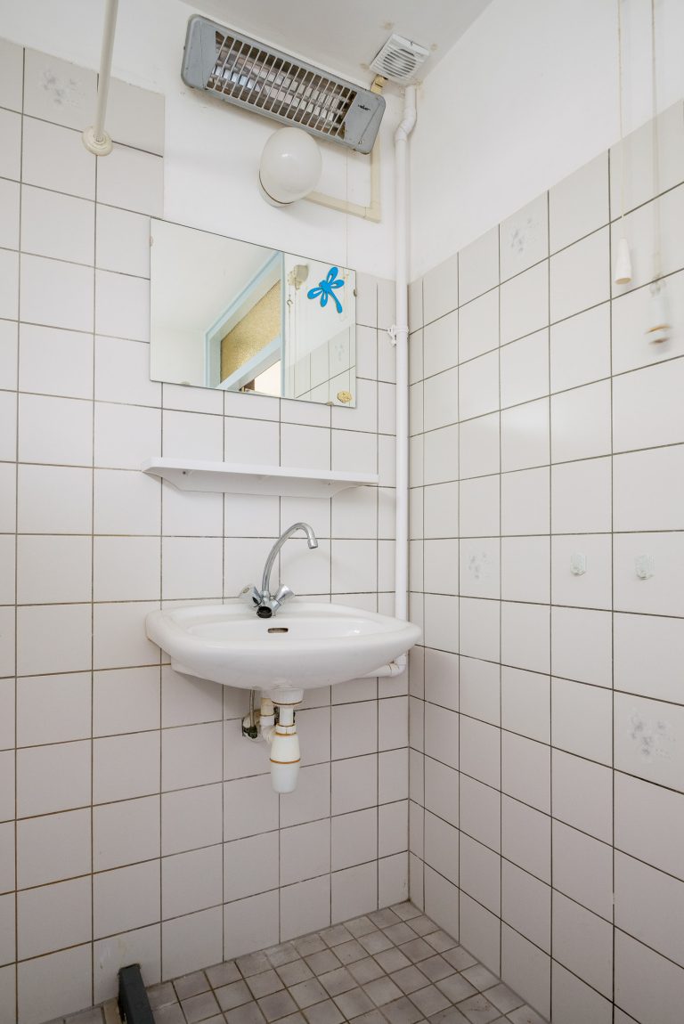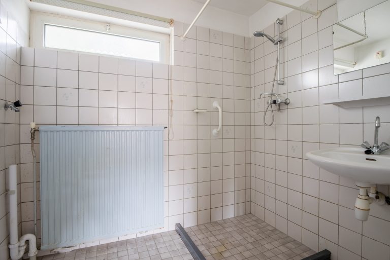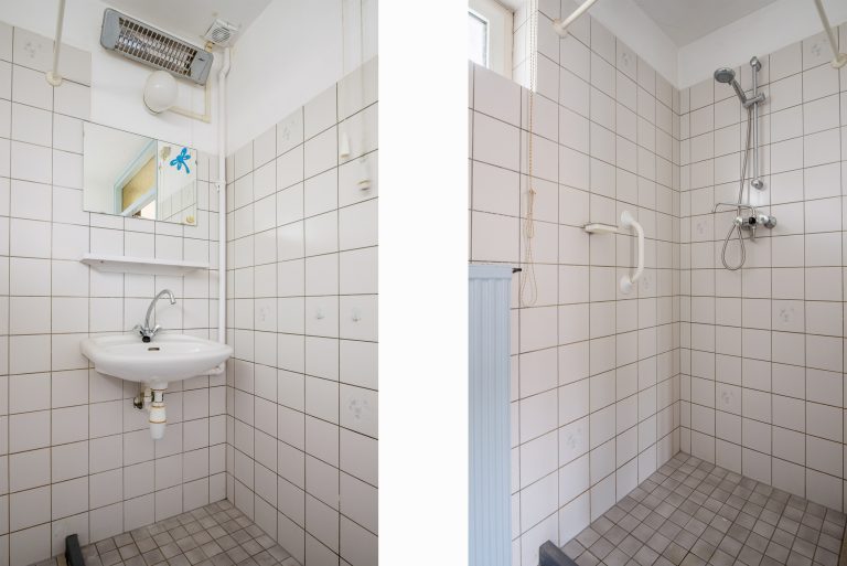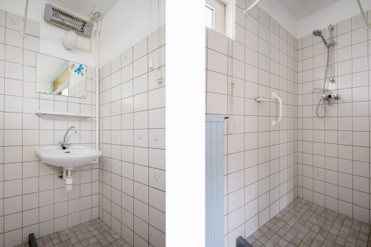 Badkamer, deels betegeld en voorzien van een wastafel, een douchehoek en de aansluiting voor de wasmachine.