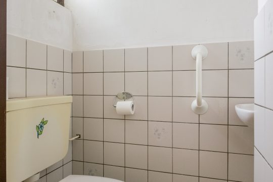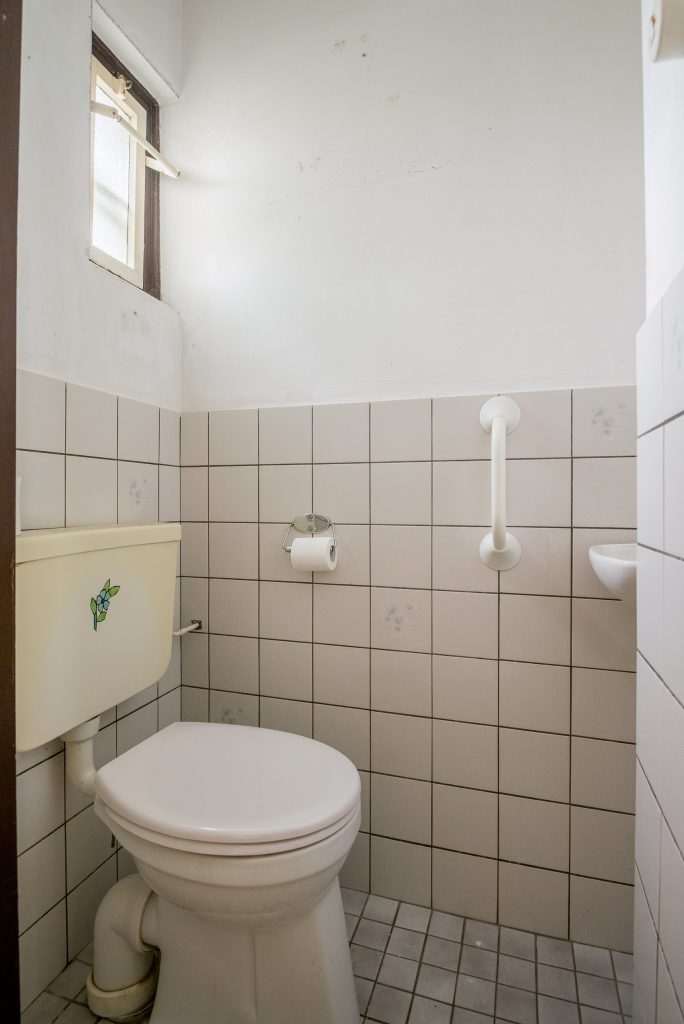 Toilet, deels betegeld en voorzien van een fonteintje en een closet met laaghangend reservoir.