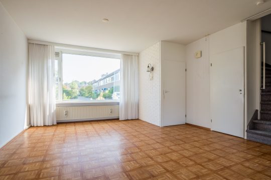 Doorzon woonkamer, met pvc vloer, behangen wanden en spuitwerk plafond. Vanuit de woonkamer toegang tot de trap naar de eerste verdieping, onder de trap bevindt zich een voorraadkast.
