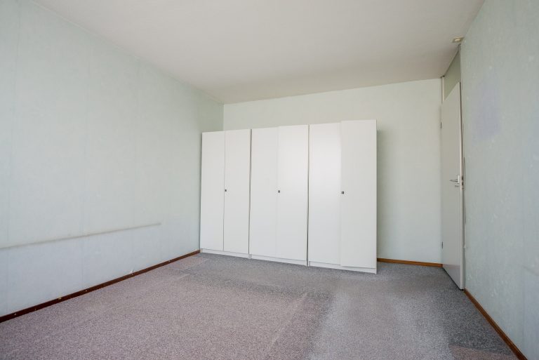 Slaapkamer 2, gelegen aan de achterzijde, met vloerbedekking, behangen wanden en spuitwerk plafond. Voorzien van 3 x tweedeurs losse kastenwand.