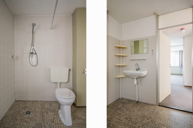 Badkamer, deels betegeld en met spuitwerk plafond, voorzien van een douchehoek, een wastafel, een tweede toilet en de aansluiting voor de wasmachine.