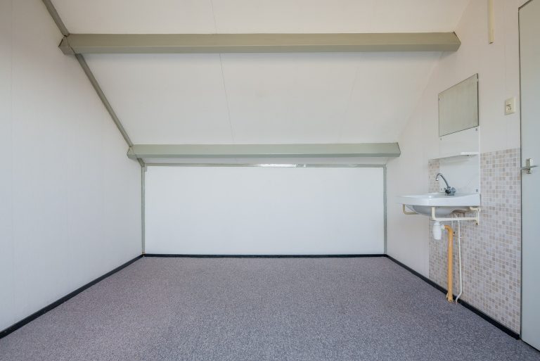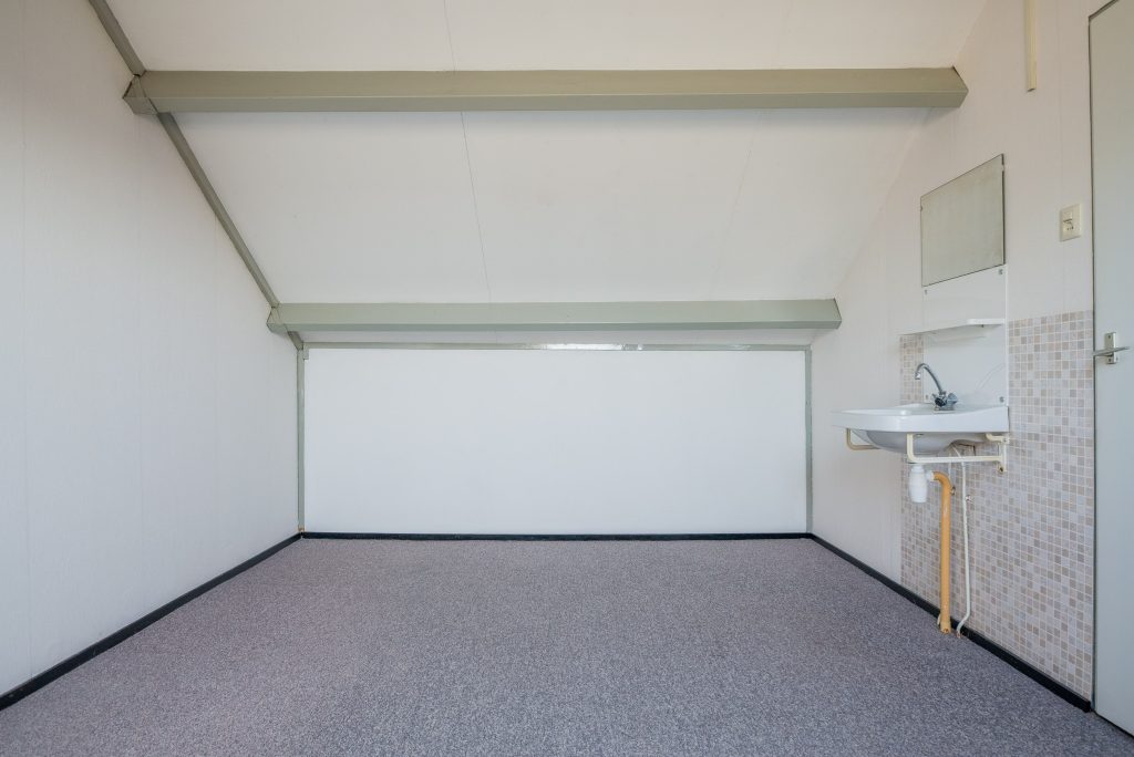 Portaal, met pvc vloer, wit schoonmetselwerk wanden en boardplaaten plafond met inbouwspots.